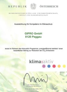 Für umweltrelevante Reduktionen des Energiebedarfs mit hohem CO2-Einsparungseffekt erhielt GIPRO eine KlimaAktiv Auszeichnungen durch den Österreichischen Bundesminister für Umwelt. KlimaAktiv ist eine langjährige Initiative der österreichischen Bundesregierung, die sowohl beratend als auch anerkennend für Leistungen von Unternehmen und Kommunen im aktiven Klimaschutz tätig ist.